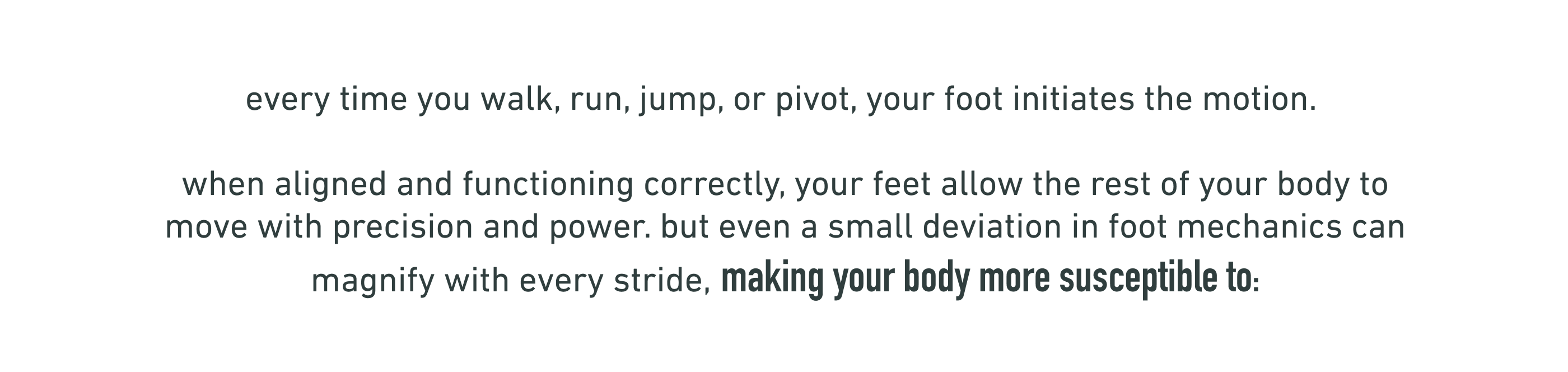 They’re the foundation of your body’s alignment, balance, and movement. With 26 bones, 30 joints, and over 100 muscles, tendons, and ligaments in each foot, this complex system works every day to support your body, absorb impact, and keep you upright and moving with ease. But when your feet fall out of alignment, the entire body feels it. Even a slight imbalance can lead to pain in the ankles, knees, hips, or lower back. Over time, these compensations can rewire how your body functions - training muscles to work improperly and increasing your risk for injury.